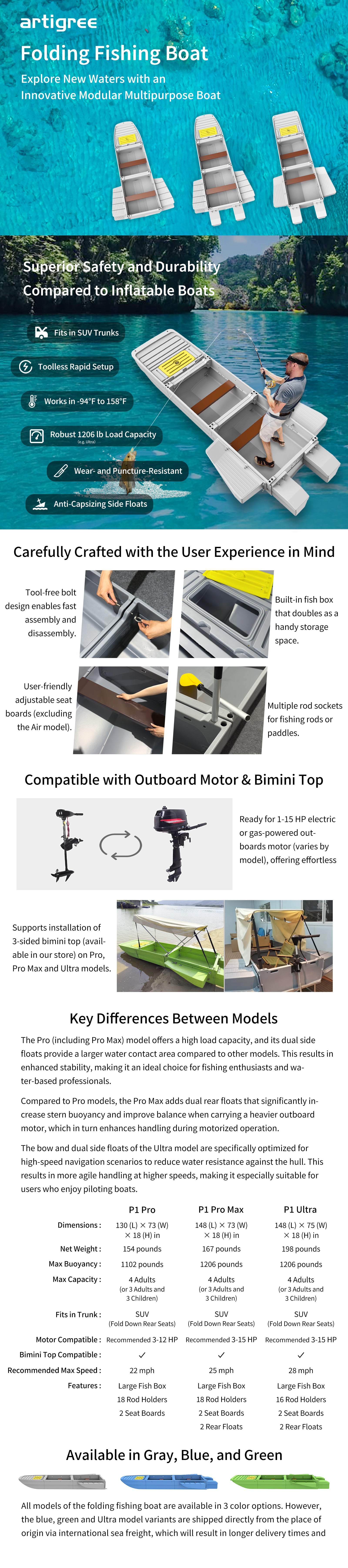 Artigree Fishing Boat, P1 Boat Fits in SUV Trunk (Blue Grey)